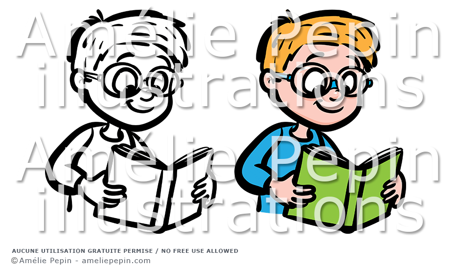 Ce dossier contient 4 modèles différents d'enfants qui portent des lunettes et qui lisent un livre avec quelques choix de couleurs de peau.