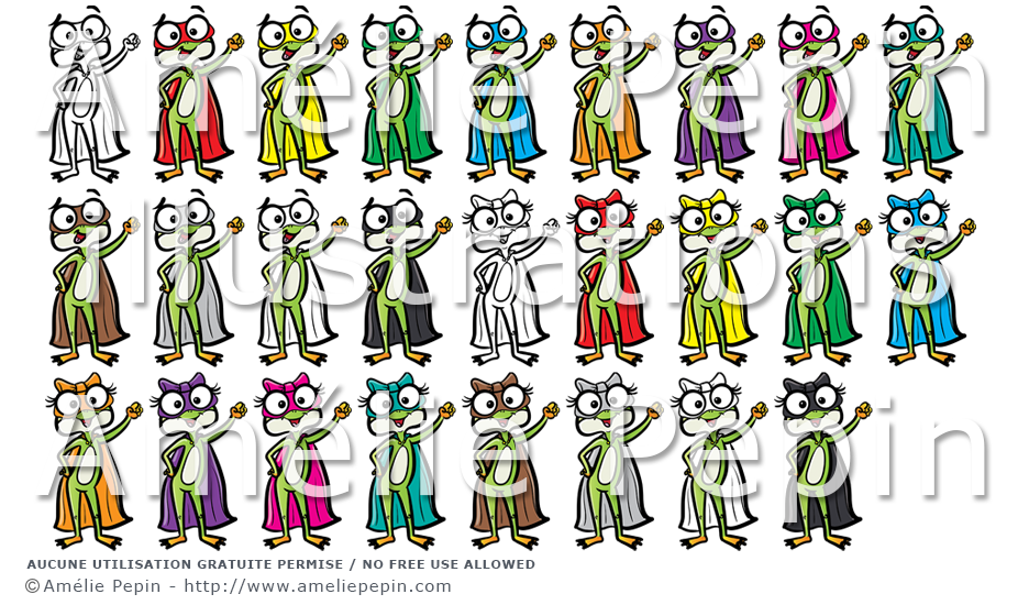 Ce dossier contient des images de grenouilles (garçons et filles) en superhéros de différentes couleurs: rouge, jaune, vert, bleu, orange, violet, rose, turquoise, brun, gris, noir et blanc.