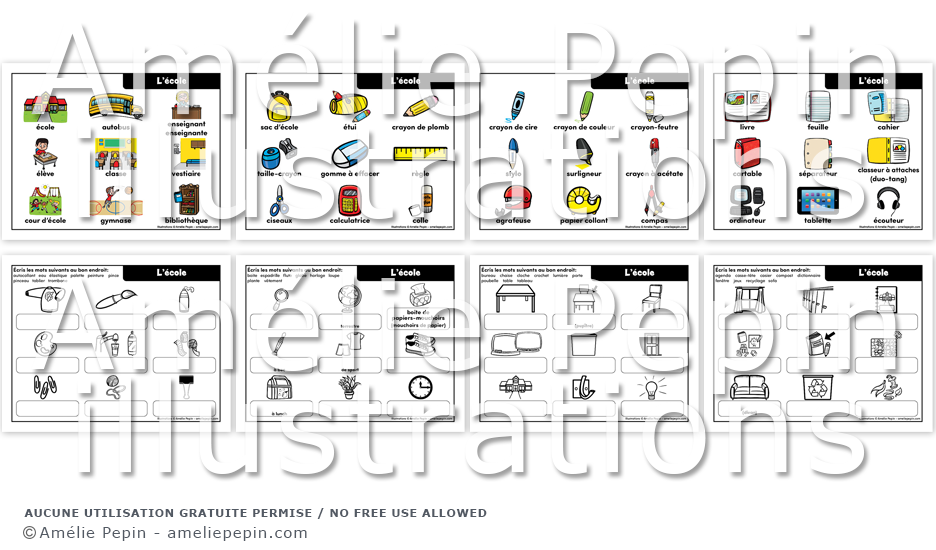 Imagier sur le thème de l'école. Le dossier contient 8 affiches et 8 feuilles d'activités pour apprendre le vocabulaire en lien avec le matériel scolaire. Dans les activités, l'enfant écrit les mots demandés au bon endroit.