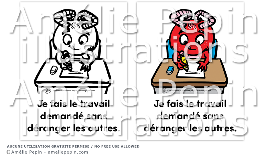 Règle de classe illustrée avec un monstre: "Je fais le travail demandé sans déranger les autres."