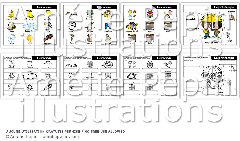 Imagier sur le thème du printemps. Le dossier contient 4 affiches et 4 feuilles d'activités pour apprendre le vocabulaire en lien avec le printemps. Dans les activités, l'enfant écrit les mots demandés au bon endroit.