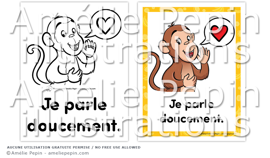 Règle de classe illustrée avec un singe: "Je parle doucement."