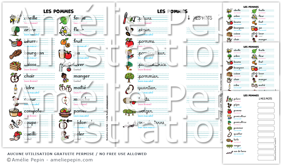 Les pommes - Liste de 32 mots illustrés (script et cursif)