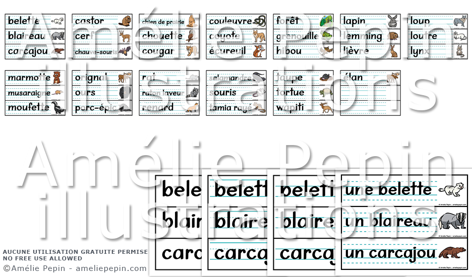 Les mots illustrés sont: belette, blaireau, carcajou, castor, cerf, chauve-souris, chien de prairie, chouette, cougar, couleuvre, coyote, écureuil, forêt, grenouille, hibou, lapin, lemming, lièvre, loup, loutre, lynx, marmotte, musaraigne, moufette, orignal, élan, ours, porc-épic, rat, raton laveur, renard, salamandre, souris, tamia rayé, taupe, tortue, wapiti.