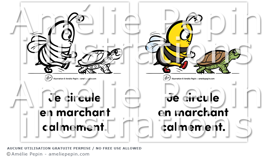 Règle de classe illustrée avec une abeille et une tortue: "Je circule en marchant calmement."