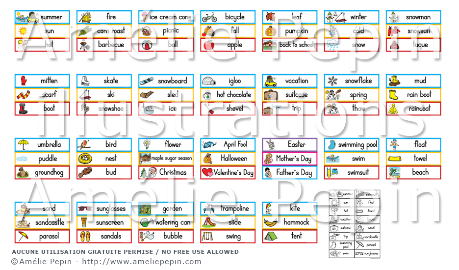 Les mots illustrés sont: summer, sun, hot, vacation, suitcase, trip, swimming pool, swim, swimsuit, float, towel, beach, sand, sandcastle, parasol, sunglasses, sunscreen, sandals, garden, watering can, bubble, trampoline, slide, swing, kite, hammock, tent, fire, corn roast, barbecue, ice cream cone, picnic, ball, bicycle, fall, apple, leaf, pumpkin, back to school, winter, cold, snow, snow, snowman, snowsuit, tuque, mitten, scarf, boot, skate, ski, snowshoe, snowboard, sled, ice, igloo, hot chocolate, shovel, snowflake, spring, thaw, mud, rain boot, raincoat, umbrella, puddle, groundhog, bird, nest, bud, flower, maple sugar season, Christmas, April Fool, Halloween, Valentine's Day, Easter, Mother's Day, Father's Day.