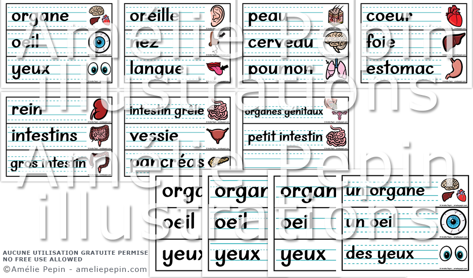 Les mots illustrés sont: organe, oeil, yeux, oreille, nez, langue, peau, cerveau, poumon, coeur, foie, estomac, rein, intestins, gros intestin, intestin grêle, petit intestin, vessie, pancréas, organes génitaux.