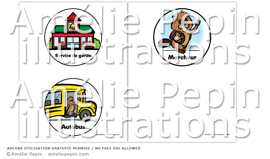 Illustrations du service de garde, de l'autobus et du marcheur avec des castors dans des cercles mesurant 4 1/2 po X 4 1/2 pouces. Ce fichier est prêt à être imprimé afin que vous puissiez découper les images et les coller dans votre système de départ.