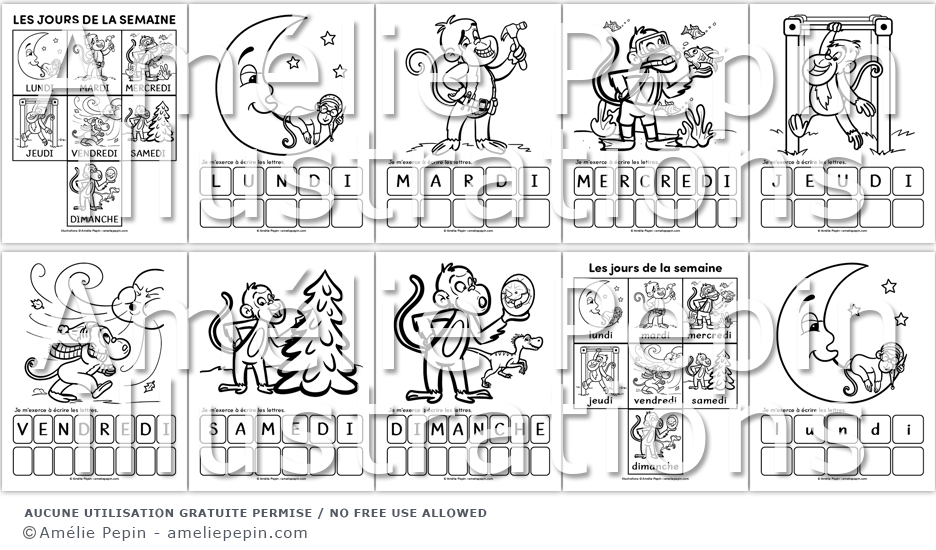 Chaque jour de la semaine est représenté par un singe à colorier avec un élément dont le son débute par la première syllabe du jour (DImanche, DInosaure). Vous pouvez demander à l'enfant de colorier seulement l'élément qui représente le son ou tout le dessin en entier. En bas de page, l'enfant peut s'exercer à écrire les lettres du jour. La première page du document contient un aide-mémoire des jours de la semaine.