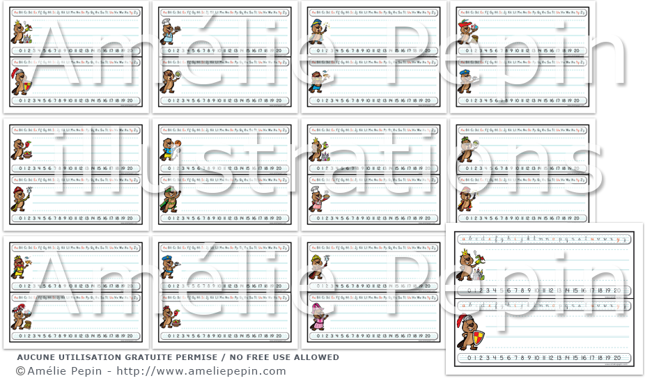Chaque étiquette contient les lettres de l'alphabet en cursive avec les voyelles écrites en rouge, un trottoir pour écrire le prénom de l'enfant ainsi que les nombres de 0 à 20. La version PowerPoint vous permet d'écrire le nom de l'enfant à l'ordinateur (il n'y a pas de trottoir dans cette version). Assurez-vous d'avoir le logiciel Microsoft PowerPoint installé sur votre ordinateur pour ouvrir cette version.