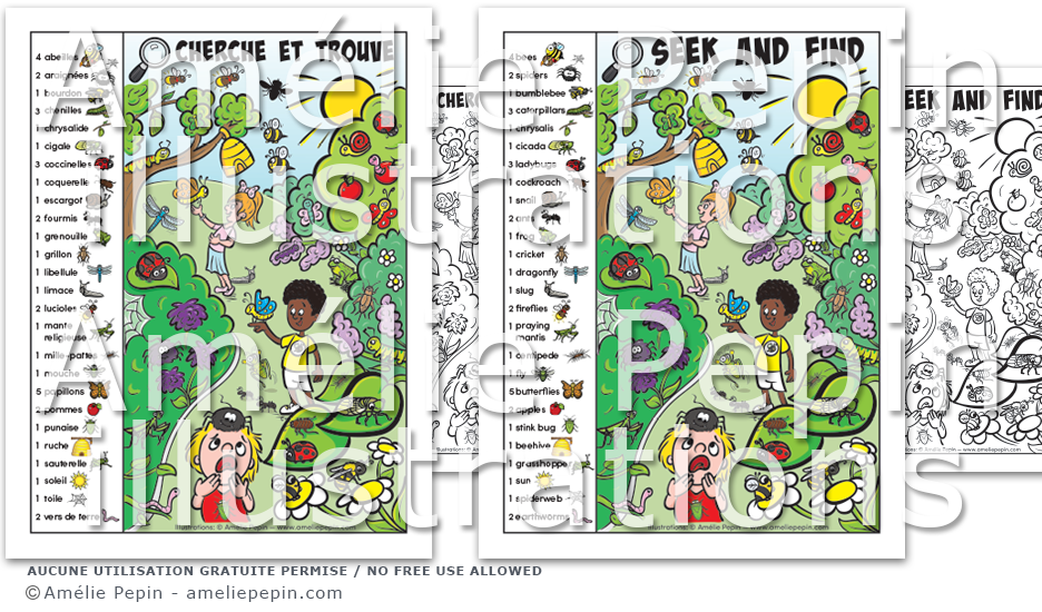 L'enfant cherche et trouve les éléments de la liste dans l'illustration. Les insectes et bestioles à trouver sont illustrés pour aider l'enfant à apprendre leur nom.