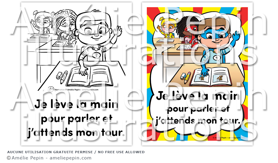 Règle de classe illustrée avec des superhéros assis au bureau: "Je lève la main pour parler et j'attends mon tour."