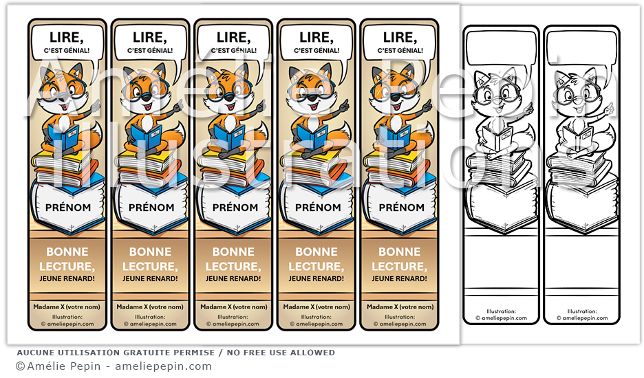 Signets aux coins arrondis illustrés avec un renard assis sur une pile de livres. Les textes suggérés que vous pouvez changer sur le signet sont: «Lire, c'est génial!» et «Bonne lecture, jeune renard!».