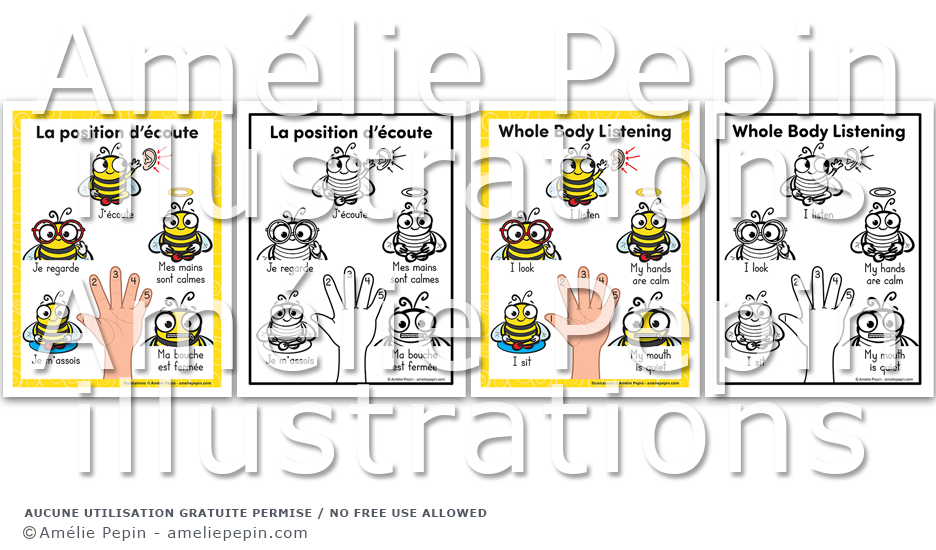 Affiches qui illustrent la position d'écoute avec des abeilles. Chaque fichier contient une affiche par page, deux affiches par page et quatre affiches par page. Versions en couleurs et en noir et blanc offertes.