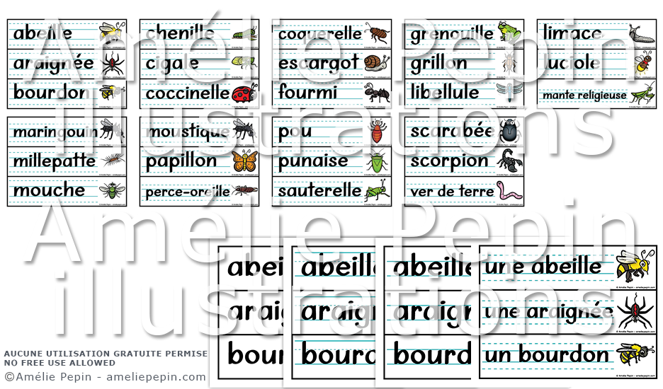 Grands mots-étiquettes pour apprendre le vocabulaire en lien avec les insectes et bestioles (27 mots sont illustrés). Quatre versions sont incluses: sans ligne, avec lignes trottoirs, avec lignes doubles ou avec lignes calligraphiques.