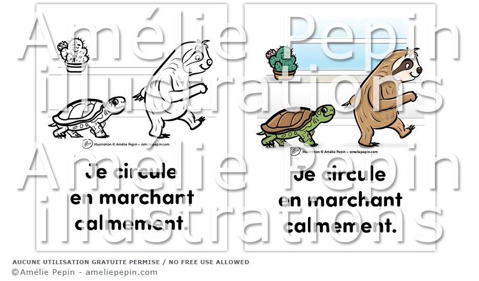Règle de classe illustrée avec un paresseux et une tortue: "Je circule en marchant calmement."