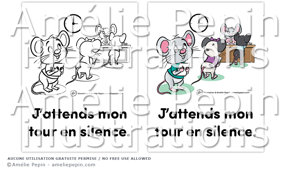 Règle de classe illustrée avec des souris: "J'attends mon tour en silence."