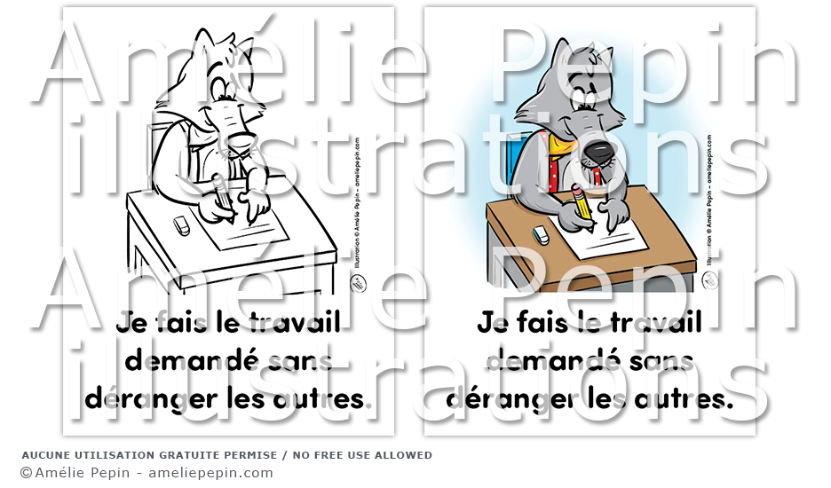 Règle de classe illustrée avec un loup: "Je fais le travail demandé sans déranger les autres."