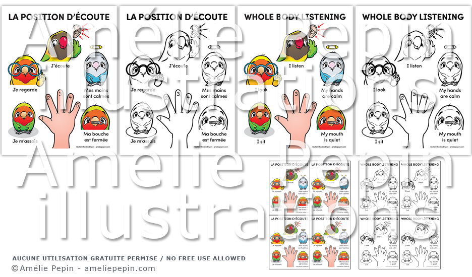 Affiches qui illustrent la position d'écoute avec des inséparables. Chaque fichier contient une affiche par page et quatre affiches par page. Versions en couleurs et en noir et blanc offertes.