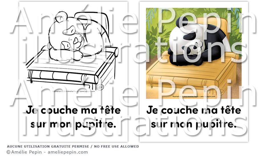 Règle de classe illustrée avec un panda: "Je couche ma tête sur mon pupitre."