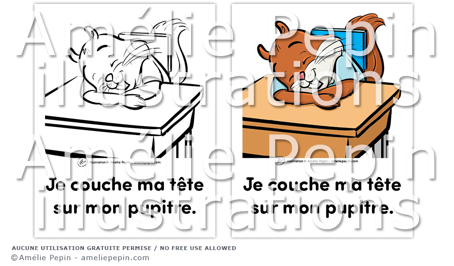Règle de classe illustrée avec un écureuil: "Je couche ma tête sur mon pupitre."