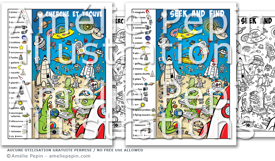L'enfant cherche et trouve les éléments de la liste dans l'illustration. Les éléments à découvrir sont illustrés pour aider l'enfant à apprendre leur nom. C'est un jeu qui développe le sens de l'observation, la concentration et le vocabulaire. L'enfant compte également les éléments jusqu'à neuf. Découvrez la vie sur une nouvelle planète dans cette illustration. Une version en noir et blanc est incluse et n'attend qu'à être coloriée!