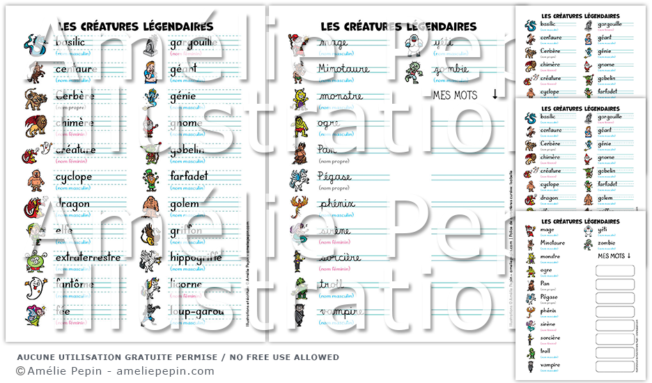 Liste de mots pour apprendre le vocabulaire en lien avec les créatures légendaires (36 mots sont illustrés). La classe de mots est écrite entre parenthèses sous chaque mot. Quatre versions sont incluses: sans ligne, avec lignes trottoirs, avec lignes doubles ou avec lignes calligraphiques. Quelques espaces sont prévus à la fin du document afin que l'enfant puisse s'exercer à écrire les mots de son choix. Vous pouvez utiliser cet ouvrage comme petit dictionnaire.
