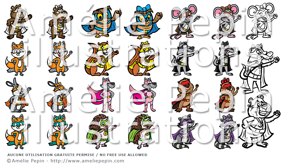 Ce dossier contient des images d'animaux de la forêt (garçons et filles) en superhéros de différentes couleurs: rouge, jaune, vert, bleu, orange, violet, rose, turquoise, brun, gris, noir et blanc. Les animaux sont: l'ours, le hibou, la souris, le renard, l'écureuil, le loup, le lapin, le castor, le hérisson et le raton laveur.