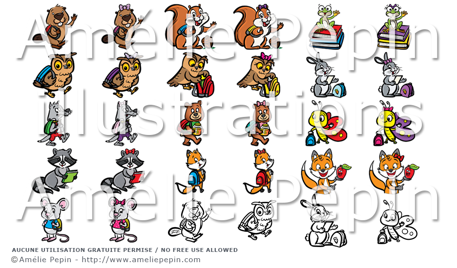 Ce dossier contient des images d'animaux de la forêt portant un sac d'école ou en présence d'une fourniture scolaire. Castor, écureuil, grenouille, hibou, lapin, loup, ours, papillon, raton laveur, renard et souris sont illustrés (versions garçon et fille).