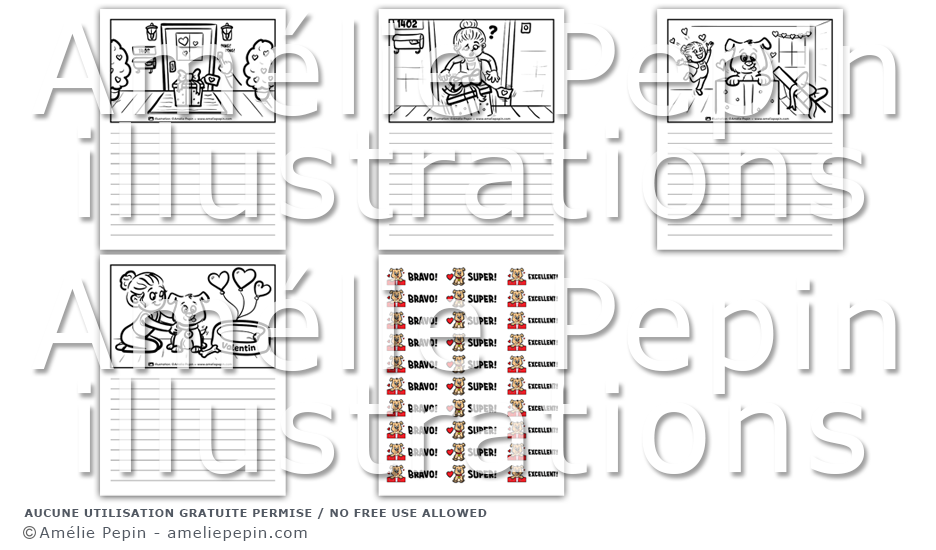 L'enfant compose son histoire en s'inspirant des images. Il peut inventer son titre et l'écrire sur la couverture avec son nom. Le document contient six images. Choisissez entre les lignes trottoirs, doubles ou simples.