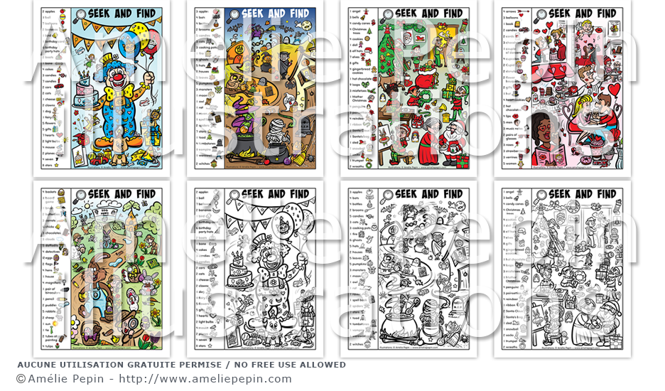 L'enfant cherche et trouve les éléments de la liste dans l'illustration. Il peut aussi colorier les versions en noir et blanc. Les fêtes illustrées sont: anniversaire, Halloween, Noël, Saint-Valentin et Pâques.