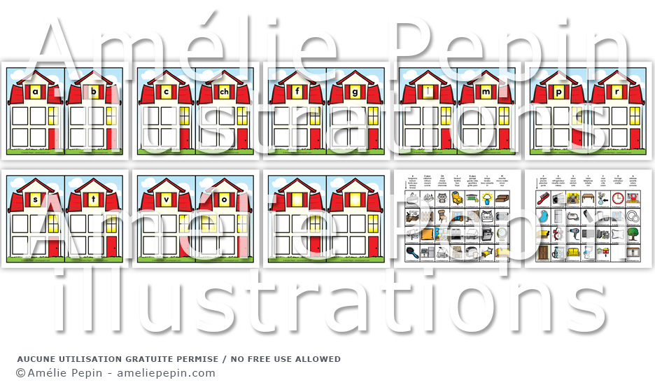 Chaque maison contient un son vedette (a, b, c dur, ch, f, g, l, m, p, r, s, t, v, o). L'enfant place trois ou quatre images dans la maison dont le nom débute par la lettre vedette. Par exemple, pour la lettre "l", l'enfant place les images: lampe, lavabo, lave-vaisselle, lit. Certaines images peuvent être placées à différents endroits selon le mot perçu par l'enfant, il est donc important de lui demander le nom de l'image si vous ne les mentionnez pas. La liste des mots est inscrite sur les pages d'illustrations.