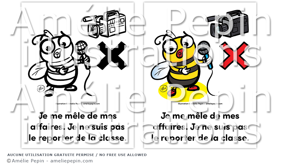 Règle de classe illustrée avec une abeille: "Je me mêle de mes affaires. Je ne suis pas le reporter de la classe."