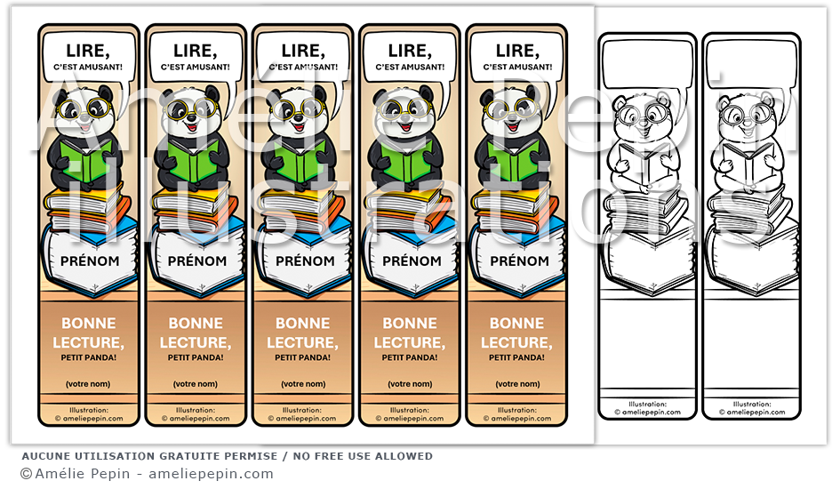 Signets aux coins arrondis illustrés avec un panda assis sur une pile de livres. Les textes suggérés que vous pouvez changer sur le signet sont: «Lire, c'est amusant!» et «Bonne lecture, petit panda!».