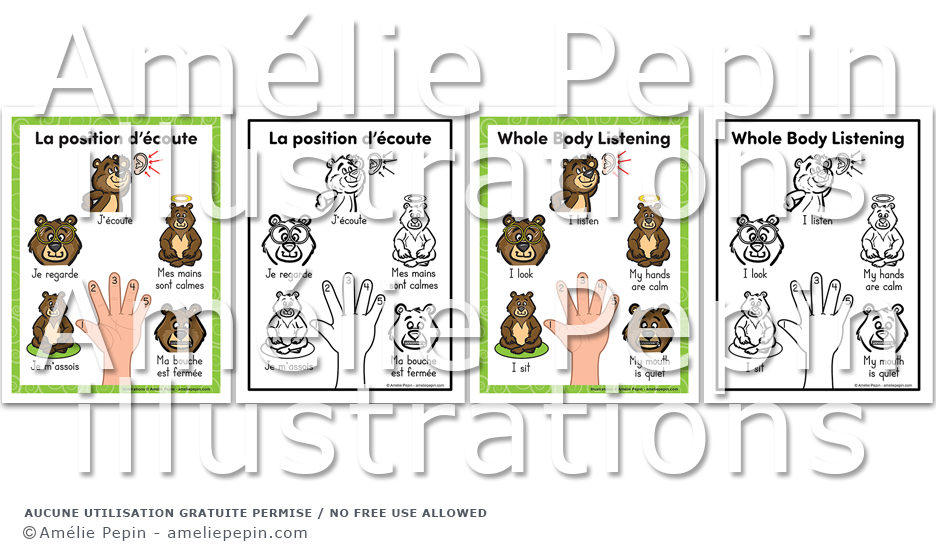 Affiches qui illustrent la position d'écoute avec des ours. Chaque fichier contient une affiche par page, deux affiches par page et quatre affiches par page. Versions en couleurs et en noir et blanc offertes.