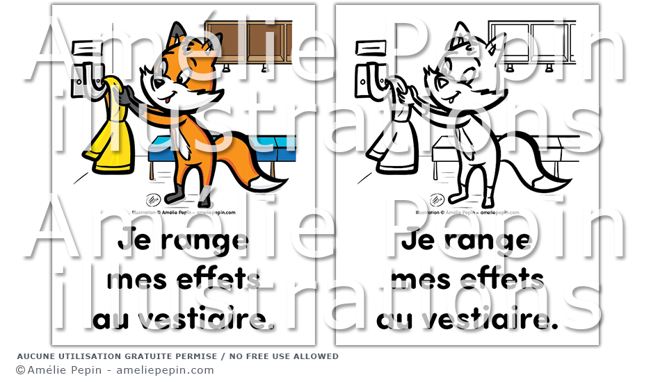 Règle de classe illustrée avec un renard: "Je range mes effets au vestiaire."
