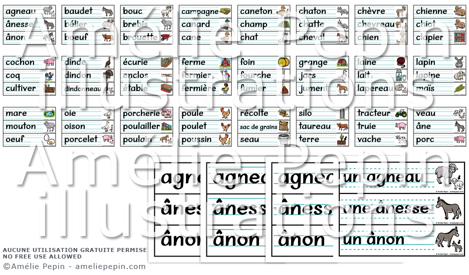 Les mots illustrés sont: agneau, ânesse, ânon, baudet, bélier, boeuf, bouc, brebis, brouette, campagne, canard, cane, caneton, champ, chat, chatte, chaton, cheval, chèvre, chevreau, chien, chienne, chiot, clapier, cochon, coq, cultiver, dinde, dindon, dindonneau, écurie, enclos, étable, ferme, fermier, fermière, foin, fourche, fumier, grange, jars, jument, laine, lait, lapereau, lapin, lapine, maïs, mare, mouton, oeuf, oie, oison, porcelet, porcherie, poulailler, poulain, poule, poulet, poussin, récolte, sac de grains, seau, silo, taureau, terre, tracteur, truie, vache, veau, âne, porc.