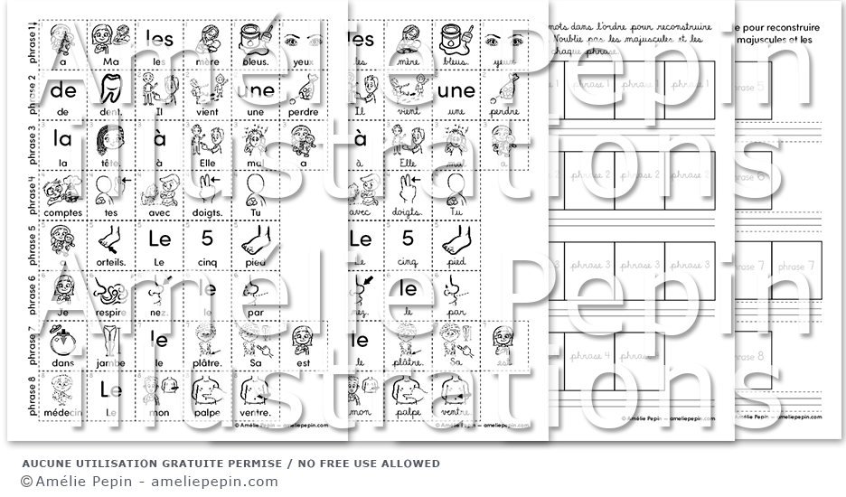 L'enfant découpe les mots illustrés de la page 3 du document (une rangée correspond à une phrase). Il replace les mots en ordre pour former une phrase et il les colle dans les carrés aux pages 1 et 2. Il peut ensuite écrire les phrases obtenues dans les trottoirs (écriture script) ou dans les lignes doubles (écriture cursive). Dans chaque phrase, la lettre majuscule et le point sont indiqués sur les images afin d'aider l'enfant. Les phrases contiennent de 5 à 6 mots.