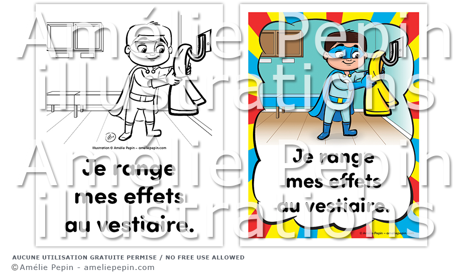 Règle de classe illustrée avec un superhéros: "Je range mes effets au vestiaire."