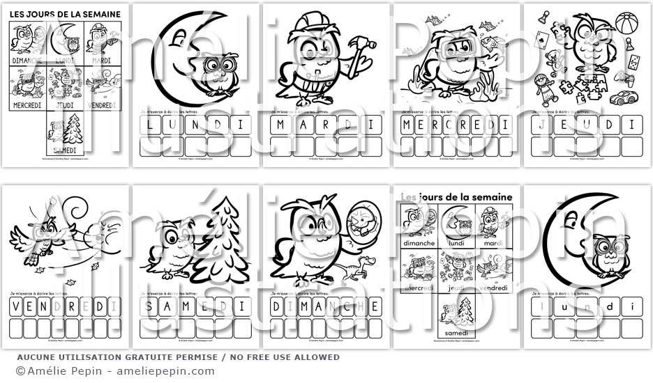 Chaque jour de la semaine est représenté par un hibou à colorier avec un élément dont le son débute par la première syllabe du jour (DImanche, DInosaure). Vous pouvez demander à l'enfant de colorier seulement l'élément qui représente le son ou tout le dessin en entier. En bas de page, l'enfant peut s'exercer à écrire les lettres du jour. La première page du document contient un aide-mémoire des jours de la semaine.