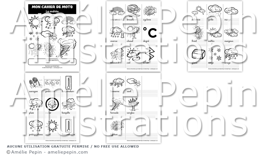 Utilisez ce document en tant que recueil de mots illustrés (dictionnaire) ou comme cahier d'écriture de mots sur le thème de la météo. Les enfants peuvent colorier les dessins. Quatre versions sont incluses: sans lignes (rectangles pour écrire), avec lignes trottoirs, lignes doubles ou lignes calligraphiques.