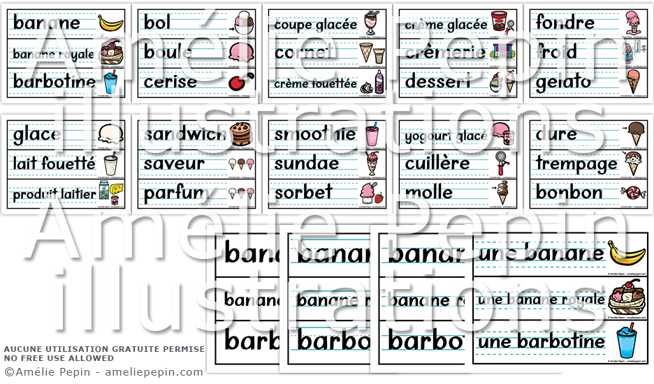 Les mots illustrés sont: banane, banane royale, barbotine, bol, boule, cerise, coupe glacée, cornet, cuillère, crème fouettée, crème glacée, crèmerie, dessert, fondre, froid, gelato, glace, lait fouetté, produit laitier, sandwich glacé, saveur, parfum, smoothie, sundae, sorbet, yogourt glacé, molle, dure, trempage, bonbon. À noter que les mots, smoothie et sundae sont des anglicismes.