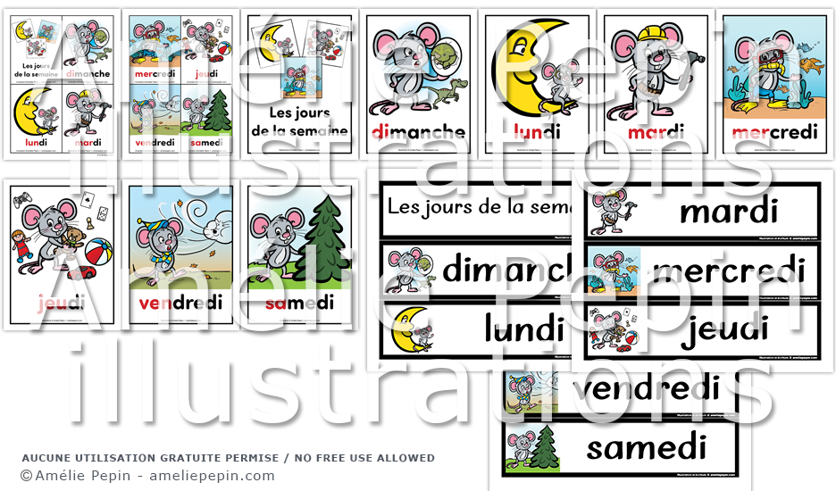 Chaque jour de la semaine est représenté par une souris avec un élément dont le son débute par la première syllabe du jour (DImanche, DInosaure).