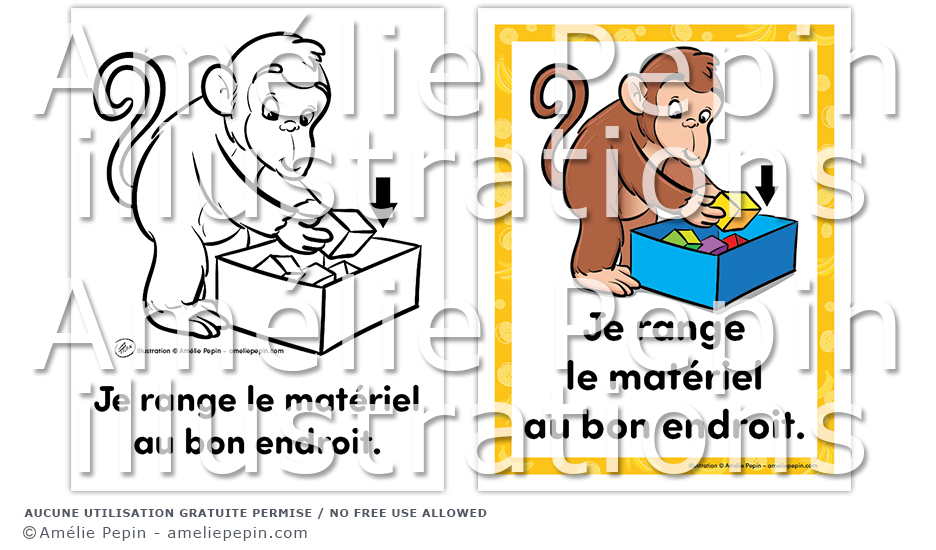 Règle de classe illustrée avec un singe: "Je range le matériel au bon endroit."