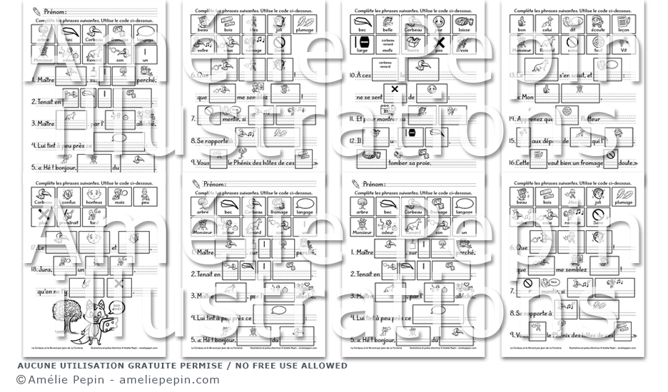 L'enfant complète la fable "Le Corbeau et le Renard" de Jean de La Fontaine en recopiant les mots illustrés. Il peut ainsi apprendre de nouveaux mots et travailler sa compréhension de lecture.