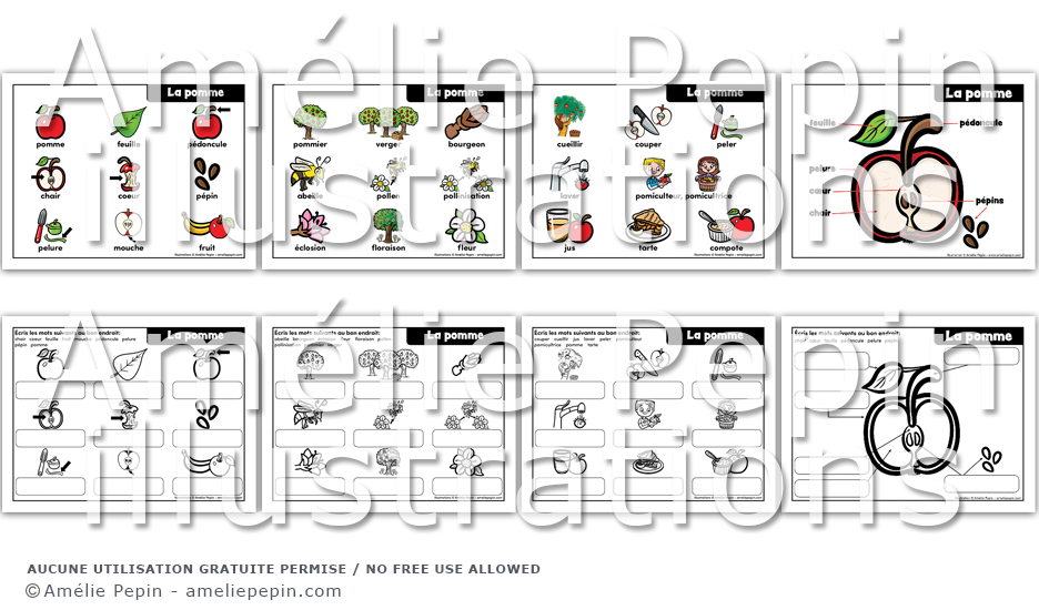 Imagier sur le thème des pommes. Le dossier contient 4 affiches et 4 feuilles d'activités pour apprendre le vocabulaire en lien avec les pommes. Dans les activités, l'enfant écrit les mots demandés au bon endroit. Il y a neuf mots illustrés par page.