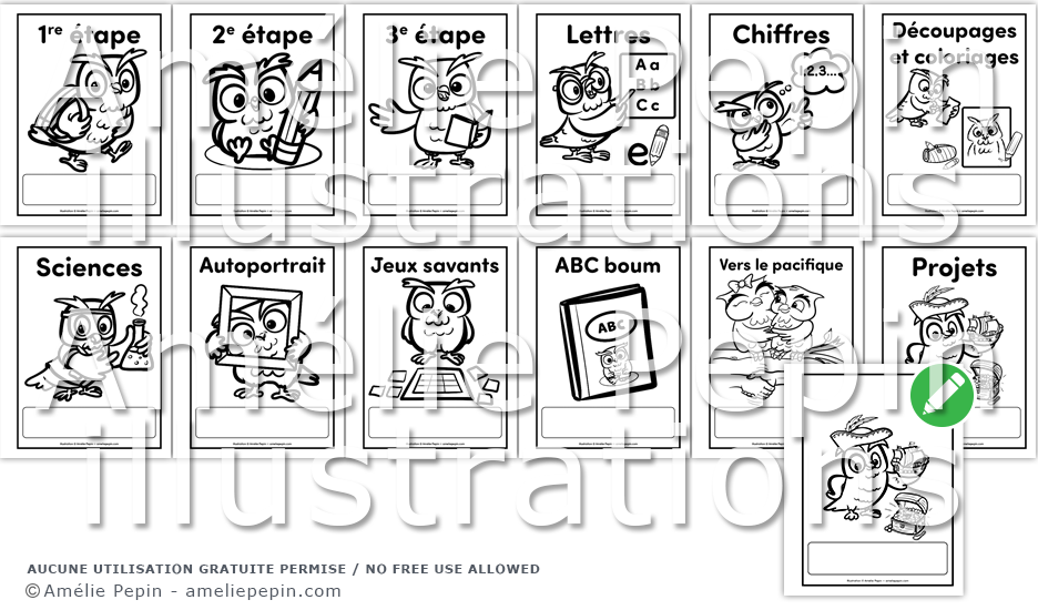 Voici 12 pages couvertures illustrées avec des hiboux pour identifier les Duo-tangs ou les cahiers. Les titres écrits en français dans la version PDF sont: 1re étape, 2e étape, 3e étape, Autoportrait, Chiffres, Découpages et coloriages, Sciences, Lettres, Jeux savants, ABC boum, Vers le pacifique et Projets.