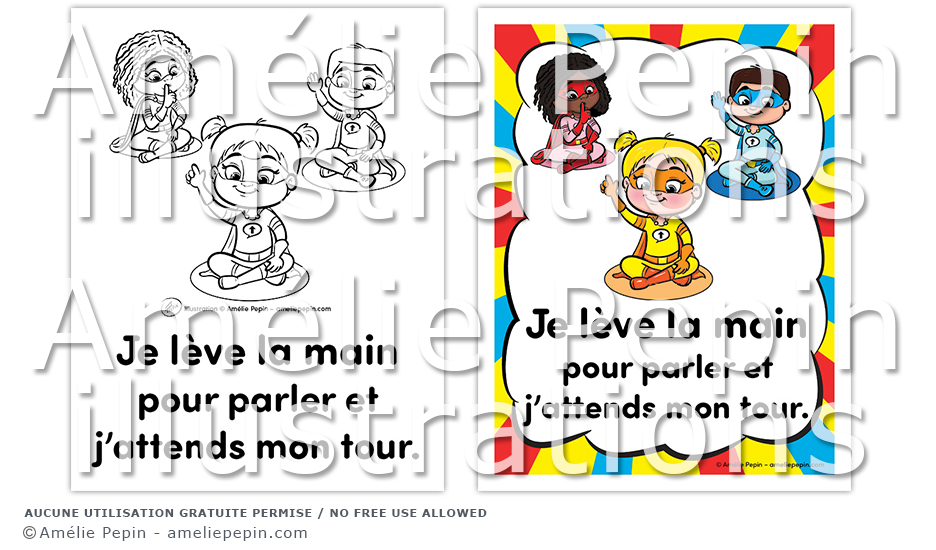 Règle de classe illustrée avec des superhéros: "Je lève la main pour parler et j'attends mon tour."