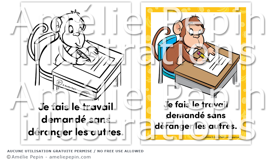 Règle de classe illustrée avec un singe: "Je fais le travail demandé sans déranger les autres."