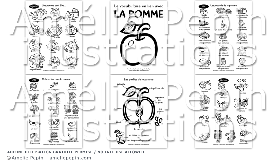 Conçu pour apprendre près de 65 mots en français en lien avec les pommes. Des illustrations dessinées spécifiquement pour chaque mot. Ce recueil est un outil incontournable pour vos ateliers d'écriture.